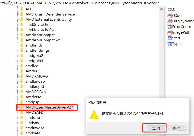 找到HKEY_LOCAL_MACHINE\SYSTEM\ControlSet001\Services內的所有AMDRyzenMasterDriver開頭的(如AMDRyzenMasterDriverV27)刪除