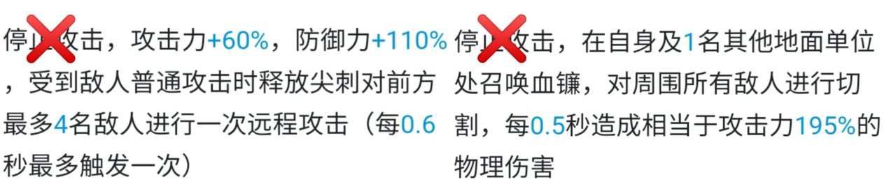 綜合來看的話,這兩個“停止攻擊”的六星近衛技能博士們更喜歡哪一個呢?假設把這倆技能的“停止攻擊”4個字刪除會怎麼樣?就是說棘刺和隱德來希在②技能期間都能平a,直觀感受到對棘刺的幫助更大,真要是這樣的話也不算超模吧