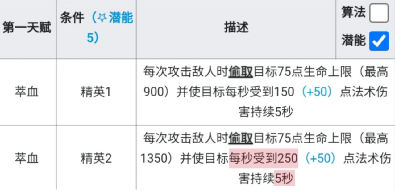 ②技能期間血鐮的傷害來源始終是隱德來希本人,那麼第一天賦的每秒法傷就可以藉助血鐮觸發了,滿潛第一天賦每秒250點法傷,這就是和棘刺的另外一個共同點了,這倆六星近衛都具有一個每秒法傷的第一天賦,血鐮造成的每秒法傷可以搭配餘③技能的火牆實現灼燃爆條,確實是一個可以採納的使用方式,而且②技能期間隱德來希受到暈眩等硬控的話也不會影響血鐮的正常輸出,也是優勢