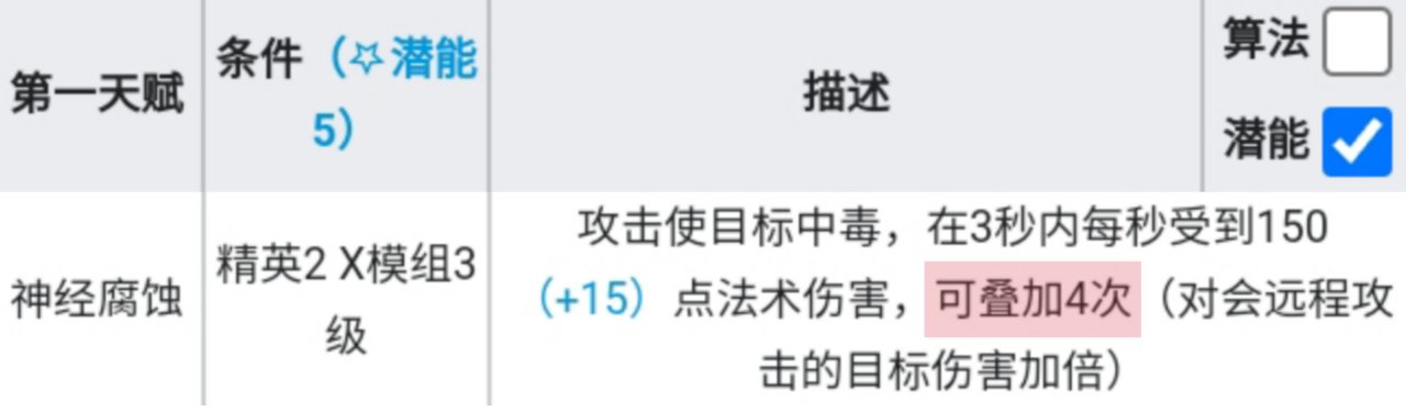 棘刺②技能期間的反擊傷害可以觸發第一天賦的秒傷,攜帶3級x模組後的第一天賦法傷量就高了很多,疊加4次的每秒法傷達到150×4=600點,對“會遠程攻擊的敵人”最高每秒1200點法傷很高了,如果後續隱德來希補充收割者y模組的話,也是按照棘刺這個“疊加”的方式去強化第一天賦就好了,另外,棘刺②技能期間能把第二天賦的回血效果完全發揮出來