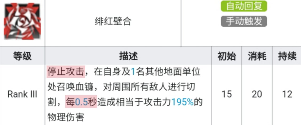 隱德來希的②技能在開啓之後12秒內停止主動攻擊,該技能持續時間是固定12秒,專精不降低技力消耗,不過7級就是20技力也很低了,迴轉比較快,專三初始技力提升至15點,落地5秒就能開,技能期間隱德來希會藉助“血鐮”進行羣體攻擊,周圍8格範圍的常態不對空真羣攻,不受外界的±攻速影響,固定0.5秒的攻擊間隔,同時也能把“血鐮”賦予其他1名地面單位,那麼就可以造成雙重傷害