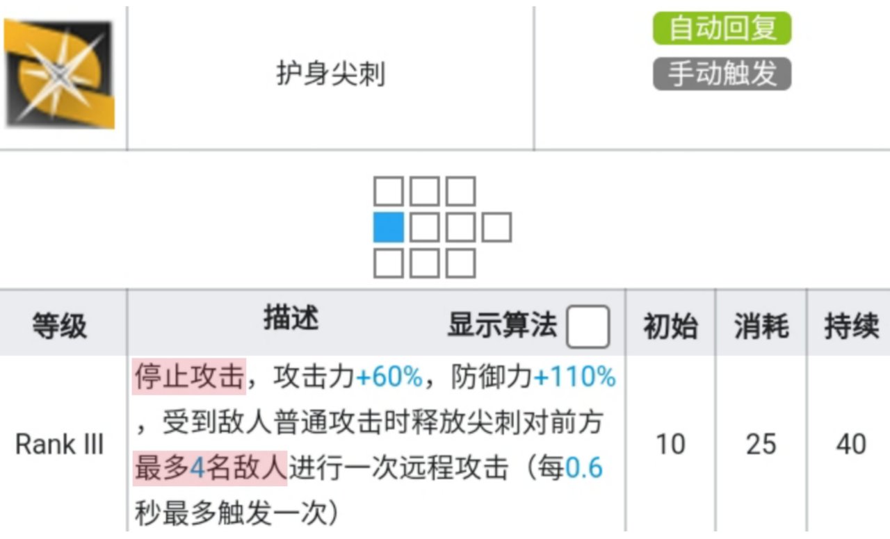 再來看棘刺的②技能,技能期間40秒內停止主動攻擊,持續時間就要遠遠長於隱德來希②技能了,雖然都具有停止攻擊的效果,但這倆技能定位不同,隱德來希②技能是短時輸出,棘刺②技能則是持續生存,以生存爲主,輸出能力相對較低,輸出多少取決於“敵人”,需要被敵人攻擊纔有反傷,最多打4,專三25技力消耗也比較低,和隱德來希②技能相差不多