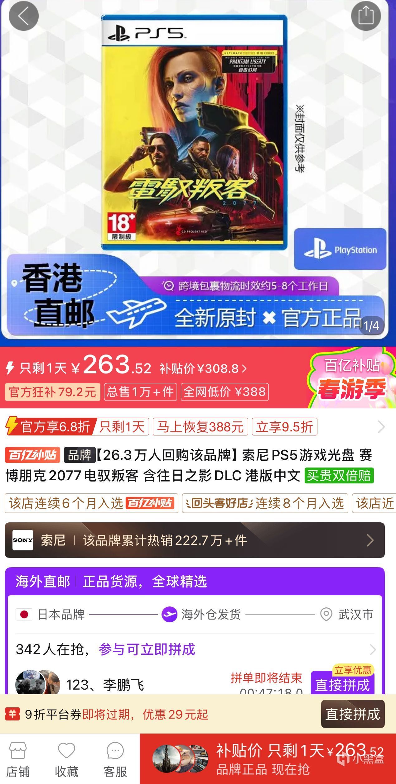 3.PS5《賽博朋克2077終極版》港版中文263.52元全新包郵,比吐槽君上次推薦又便宜了45元,應該還有下降空間,終極版遊戲包含2077本體以及DLC追加章節“往日之影”,之前買過PS4實體版遊戲的玩家也可以單獨去鹹魚收一張DLC碼,現在行情大概150至160元左右。