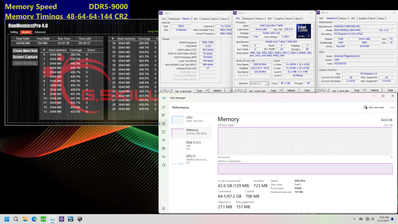 第二套幻鋒戟爲 DDR5-9000,時序爲 CL 48-64-64-144,容量是 64 GB(2 x 32 GB),支持 Intel XMP 3.0。