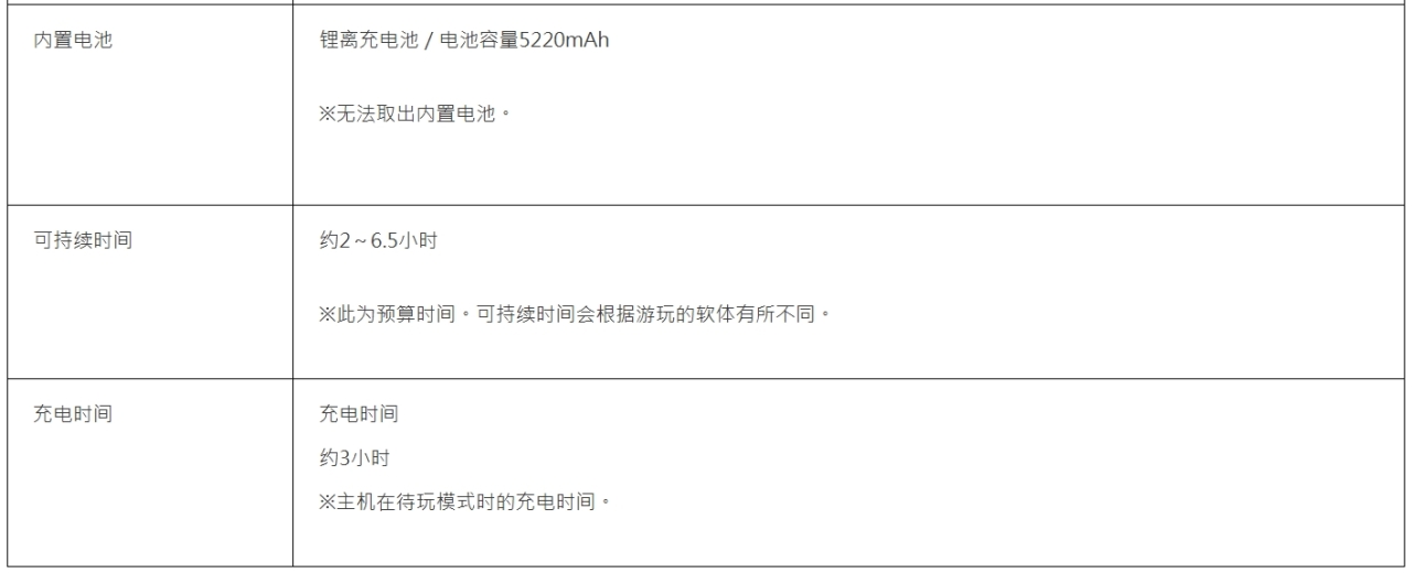 NS2內置一塊5220毫安時電池,續航時間根據遊戲不同約爲2~6.5小時。