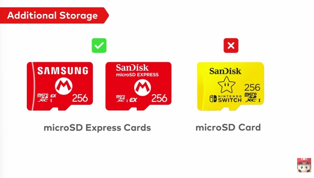 NS2的外置儲存僅支持「microSD Express」儲存卡,雖然外觀和現在的microSD看起來一樣,但速度要快很多。重點強調:NS2不支持現在的microSD卡,只能使用microSD Express卡。