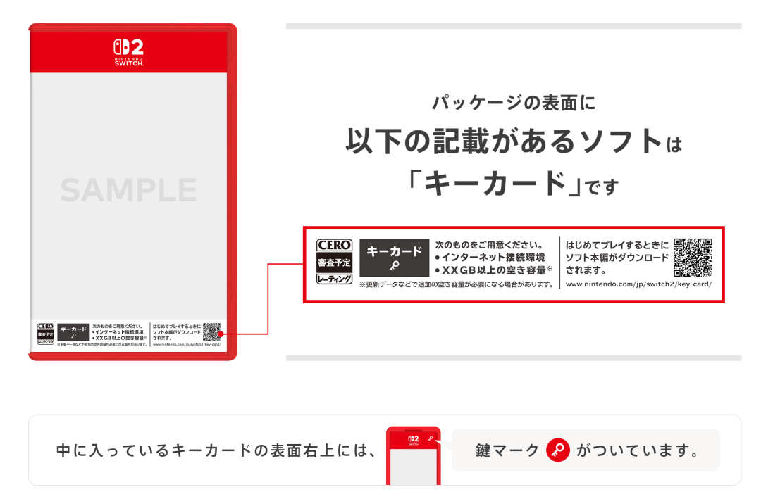 並非所有NS2卡帶都採用鑰匙卡,目前僅有部分NS2遊戲確認使用鑰匙卡,大多數遊戲仍然是自帶數據的,包括《馬力歐卡丁車世界》《咚奇剛蕉力全開》等卡帶都和現在無異,《賽博朋克2077終極版》甚至使用了64GB卡帶。