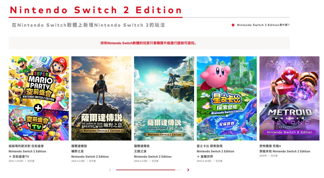 以上幾個都是付費升級,同時也有多款遊戲可以免費升級至NS2版本,獲得更好的視覺效果,包括《塞爾達傳說 智慧的再現》《超級馬力歐 奧德賽》《寶可夢 朱紫》《超級馬力歐 3D世界+狂怒世界》等。