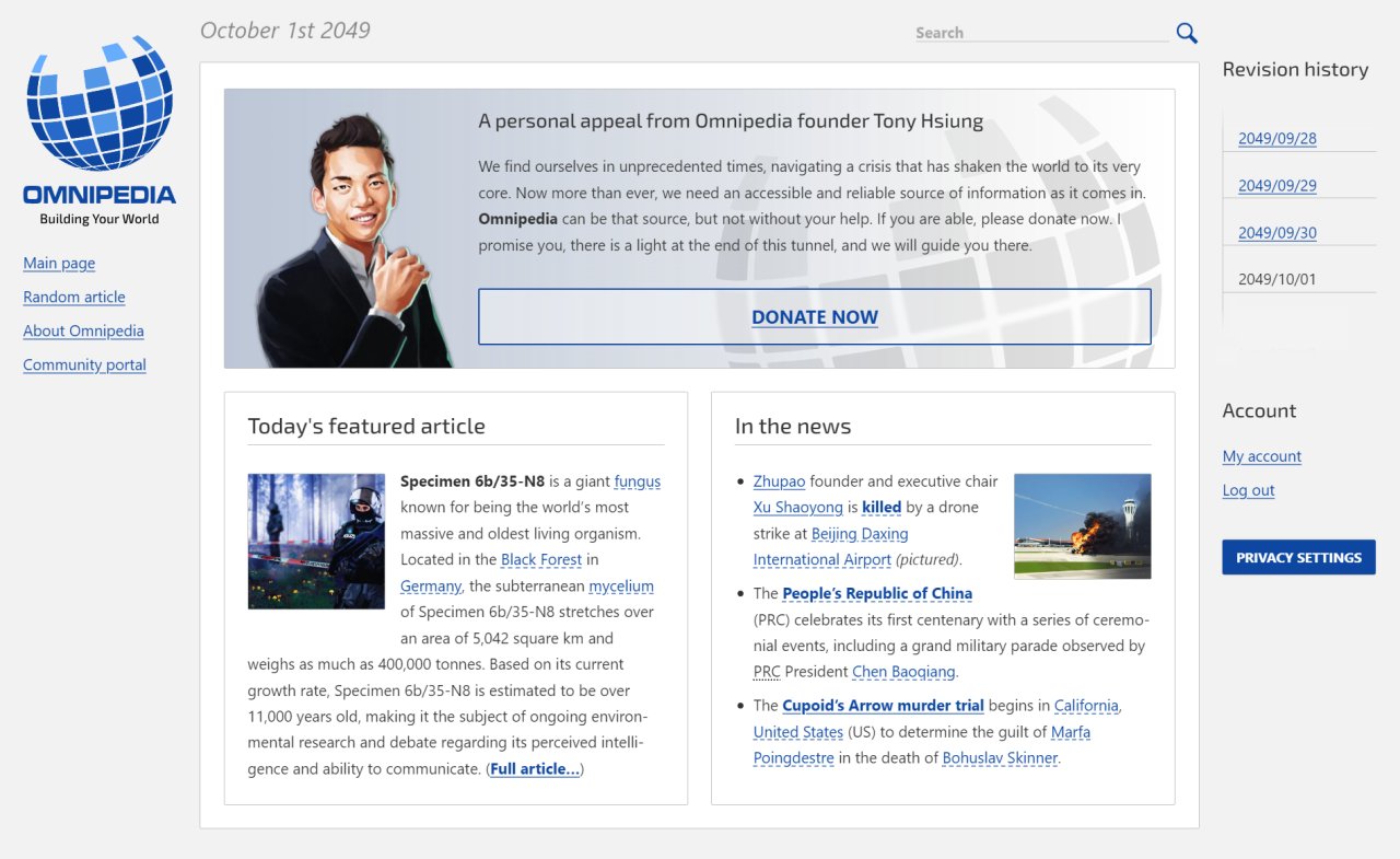 這款遊戲我是真的只聽說過了,好像與其說是“遊戲”,不如說是一種形式很新的“偵探”小說,而這個偵探指的是玩家,玩家要做的是在一個虛構未來世界的“維基百科”中,通過瀏覽各種百科條目,以及類似現實中瀏覽百科一樣的超鏈接挖掘,來理解整個世界觀,以及其中暗藏的謀殺案真相。