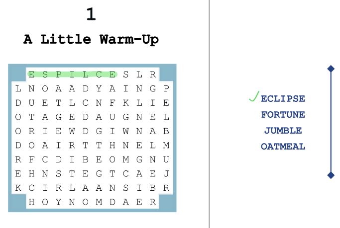 普通的找詞謎題(Word Search)是像上圖一樣,左邊一個大的字母網格,右邊是一些單詞,目標是在左邊的網格里找到連續拼寫的右邊單詞。但本作很明顯不普通,內含一些需要橫向思考的“猜規則”要素,可以說暗藏玄機。具體我就不劇透了,免費,大家可以自己嘗試。