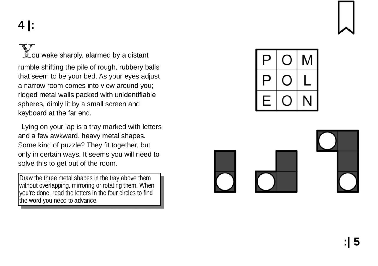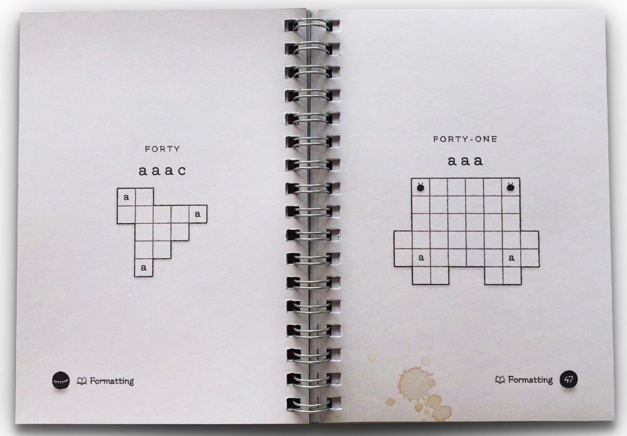如上圖所示,這個作品是一本解謎書,主打規則發現/猜規則。在這本書的“世界觀”內,我們所看到的是關於“Abb”生物的“書寫系統”現存的最後一份文獻,而這個文獻本身也源自某種“習題集”,題目形似“收納謎題”(將一些形狀不重疊地放入指定空間內的謎題)。書中的背景和規則介紹大部分都被“方便”地燒掉了,只剩下了題目本身。