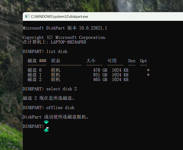 然後回車,就能成功把你所選的硬盤脫機了!這時候就可以回到右下角狀態欄那裏,可以發現硬盤標誌已經消失了!就可以直接拔掉u盤硬盤了!