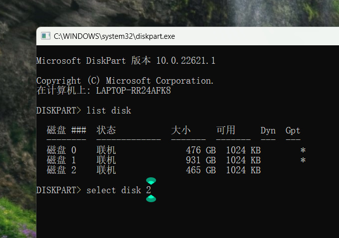 重複步驟②,輸入“list disk”