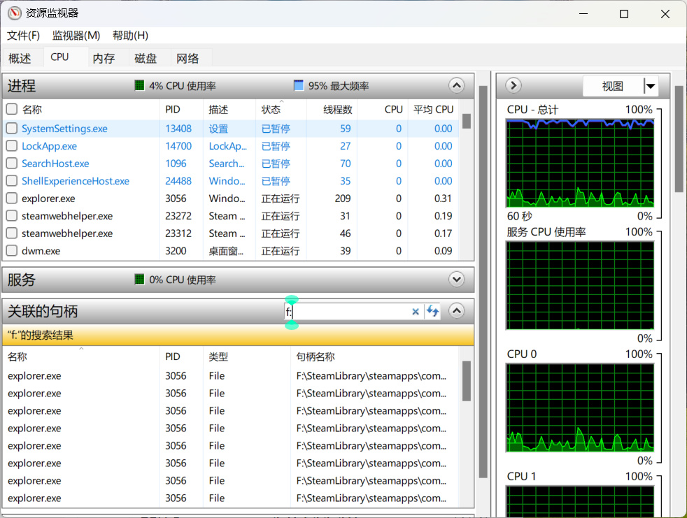 在打開的資源監視器窗口中,切換到CPU這一欄中,然後找到下方的關聯句柄,在下方的搜索框中輸入硬盤的盤符(如f:)。