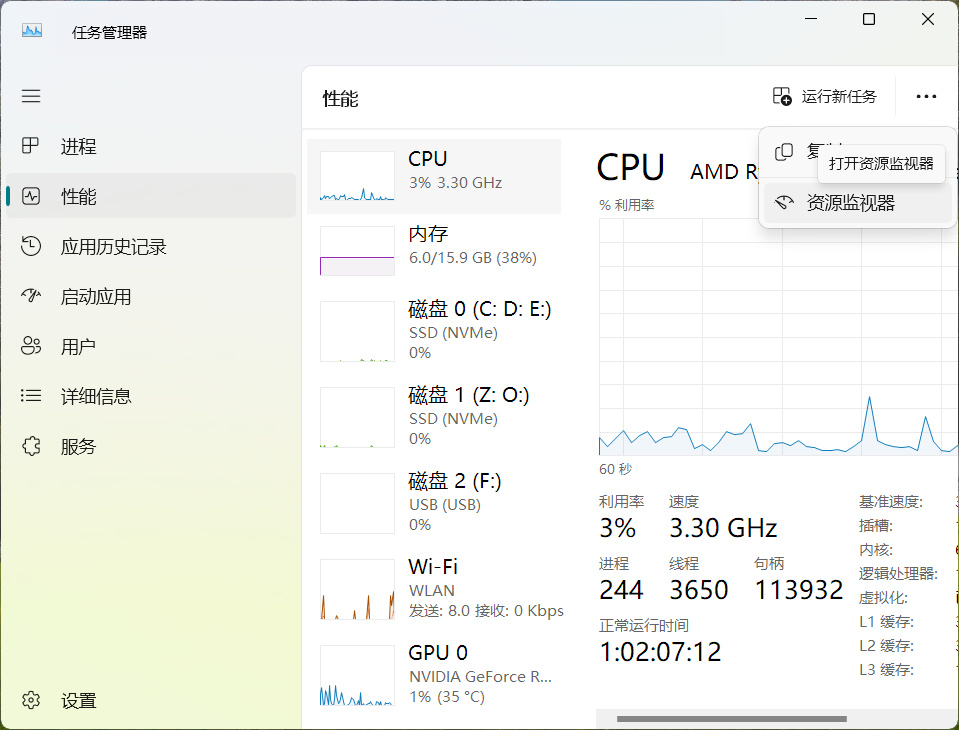 在任務管理器窗口中,點擊切換到“性能”這一欄中,然後界面右上角點擊“…”選擇打開資源監視器。
