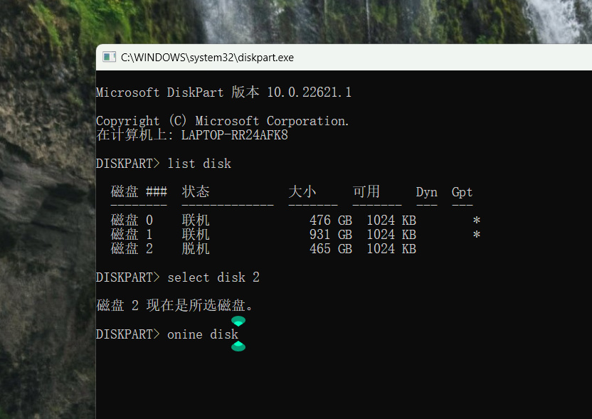 最後重複步驟④,不過這次改成輸入“online disk”回車,就把磁盤聯機了,這時候就可以正常使用硬盤了!媽媽再也不用擔心我沒內存玩遊戲了!