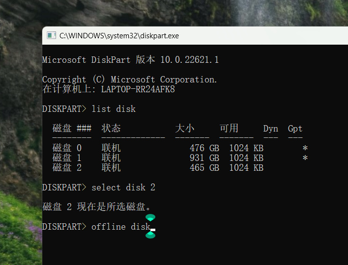 步驟④:回車後,會提示磁盤n是你所選擇的磁盤!再輸入“offline disk”