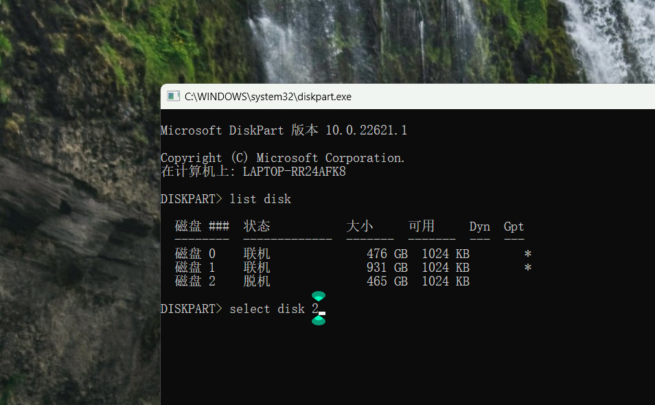 重複步驟③(這時候是可以看到我之前所脫機的磁盤2,也就是磁盤f:),輸入“select disk(加你要脫機的硬盤序號)”