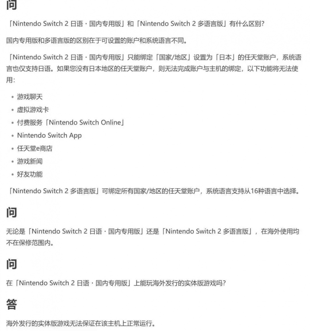 不過,以上這些也只是建立在初代Switch實際情況與主機遊戲歷史沿革基礎上的推測——畢竟,我們還沒有拿到真機,任天堂也沒把一切說清楚。他們也沒明說“無法保障外區遊戲卡帶正常運行”究竟是無法讀盤、不能聯網,又或是不可選擇語言。