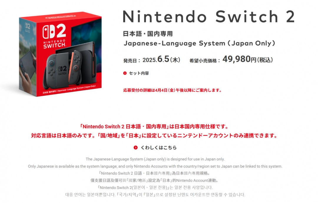 在發佈會的最後,Nintendo Switch 2宣佈將區分“日版”和“國際版”,前者是隻能登陸日區賬戶,限定系統語言爲日語,無法保障外區遊戲卡帶正常運行的“日本特供版”。若想使用其他語言,玩家就需要購買不鎖區的“國際版”。