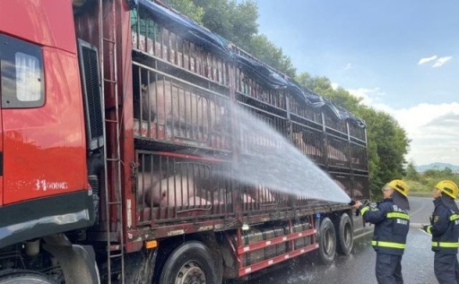 上周,重庆渝北区一辆运送100来头生猪的大货车向消防队求助。高温之下,不仅人受不了了,猪也受不了了,许多猪已经昏厥了。消防队员用高压水枪进行了10分多钟的消暑降温,才让这些猪重新清醒。