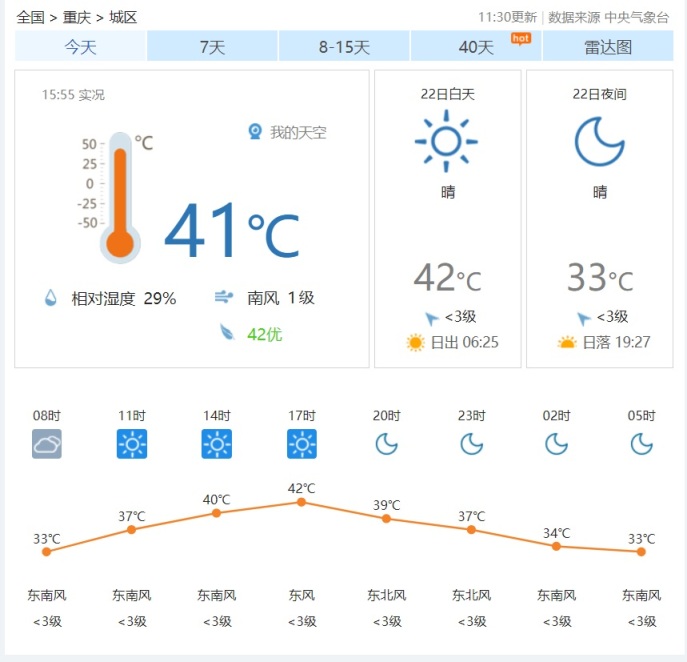 自七月以来,重庆的最高气温基本上很少有跌破40°C的,一直坚挺到现在。并且,每天在40°C以上的时间段基本上是从中午12点到晚上20点甚至更晚,基本上只有早上稍微“凉快”一点。(虽然30°C以上在有的省份已经算高温了)