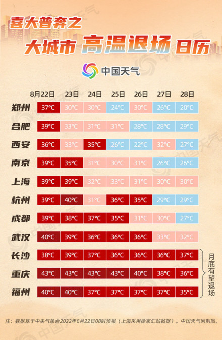 不过,好消息是这波热浪即将退去,预计到月底高温会逐渐退场。尽管如此,长沙、重庆、福州仍将展开高温“拉锯战”,还会炎热一段时间,希望气温可以早日回落吧。