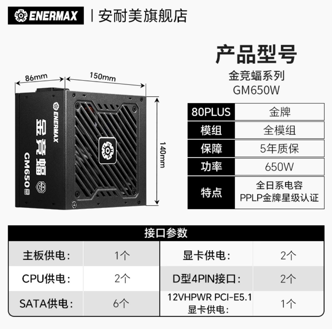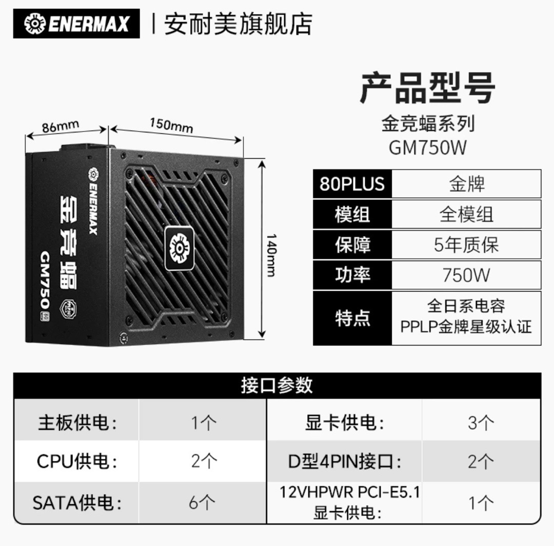 5、安耐美金競蝠,算是艾派電競a650的全面升級款,方案全面高一級。有全模組和直出款選擇,5年質保也是可以支撐到下一臺電腦。同時750w和850w也是比較不錯的電源,近期還是能選擇850w就選850w電源,價格相差不多。