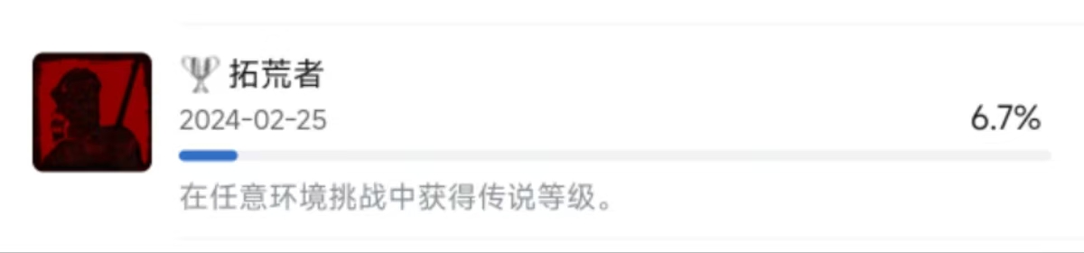 所谓环境挑战指的是生存、狩猎、寻宝等挑战,其中一个满级即可解锁该成就,想达到游戏进度百分百的话,则需要全升满。