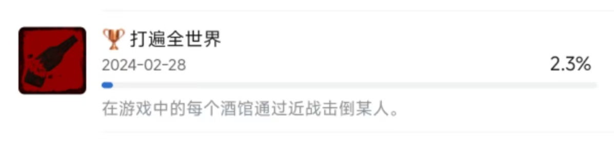 分别在犰狳镇、盗贼领地、埃斯卡莱拉、岔路酒馆、沙漠之花、晨屋、黑水镇这7个地点的酒馆中通过近战打倒一个npc即可完成,需要注意打有佩枪的人,他们会跟你对打,如果没没有就不算。