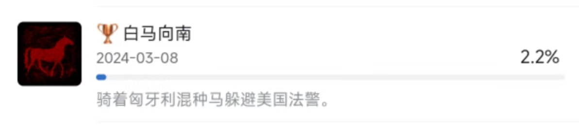 匈牙利混种马(三星纯白马),推荐跟 5000 悬赏那个成就一起做。 因为要先触发警察,再叫马才行,所以推荐骑着白马先在黑水镇藏身处保存一下,然后刷悬赏➡️跑路➡️消除警戒之后随便找个地方保存➡️睡醒显示被通缉➡️叫出白马跑路➡️跳杯