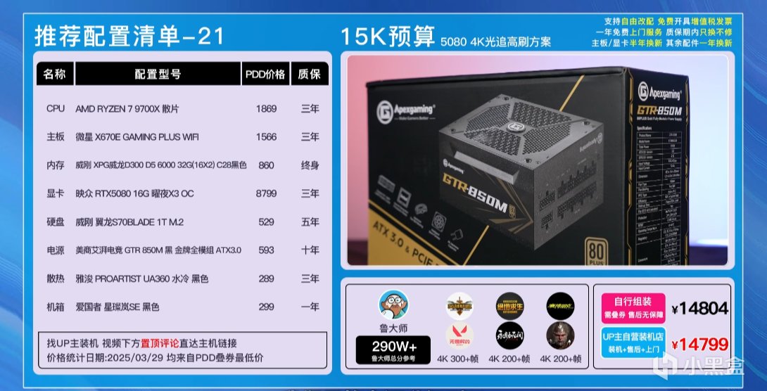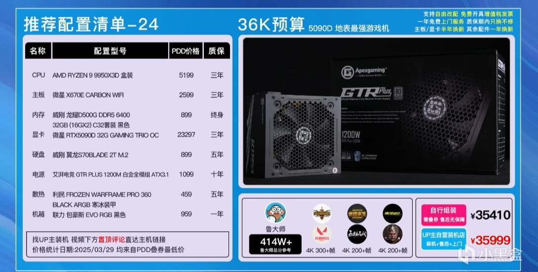 最後這套方案選擇的是9950X3D來搭配5090D,目前生產力以及遊戲性能都是T0級別的主機,電源這裏我們也提升至1200W的GTR PLUS,同樣也是10年的質保以及全日系的電容的用料。
