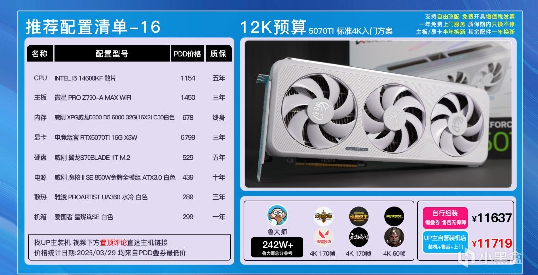 搭配5070的方案,考慮到可能會有生產力的需求,我們搭配的是D5平臺,主板保留微星B760M GAMING WIFI,內存與硬盤同樣也是威剛D300 6000 C30 16Gx2組成32G的雙通道以及威剛的S70B PCIe4.0 TLC顆粒自帶獨緩1TB,電源是升級至長城的E7 750W金牌全模組ATX3.1白色。整機搭配的是一套純白海景房方案。