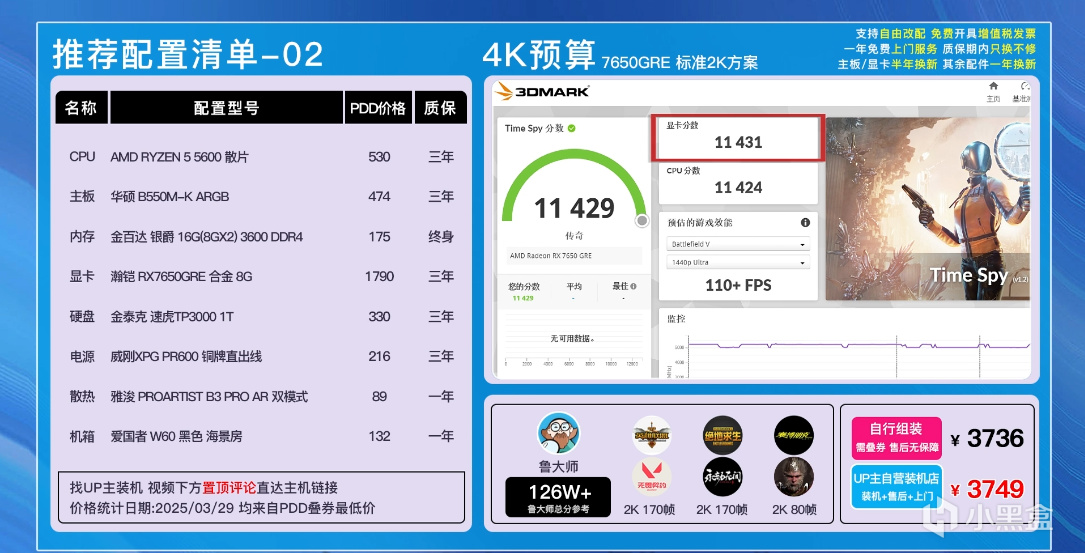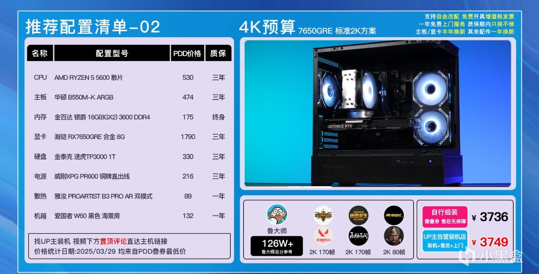 7650GRE的方案,我們是在剛纔配置的基礎上更換了顯卡,並且是搭配出了一套黑色無立柱海景房整機,5600搭配華碩B550M-K ARGB的板U組合我們依然可以保留,散熱方面爲了保證整機的顏色統一,推薦使用雅浚的B3 PRO 四熱管風冷散熱。