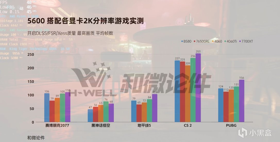 在我們測試的5款遊戲中,測試環境都選擇了2K分辨率畫質全最高,在一些喫顯卡的3A大作中,即便是開啓各自的超分技術後,對於7650GRE和4060這兩張顯卡來說還是有點勉強的,但是對於B580、4060Ti和7700XT來說就構不成什麼壓力了,網遊這裏追求極致的幀數,7700XT會更加適合你一些,如果你追求的是高質量的3A遊戲,那麼4060Ti以及B580我們都可以選擇,B580更偏性價比,在部分遊戲中幀數表現可以達到接近4060Ti 的水平,4060Ti的DLSS很多遊戲都有支持,而且優化也更棒。如果你打算用7650GRE和4060來運行2K分辨率的3A大作,可以考慮降低一點畫質來換取更加絲滑的幀數體驗。