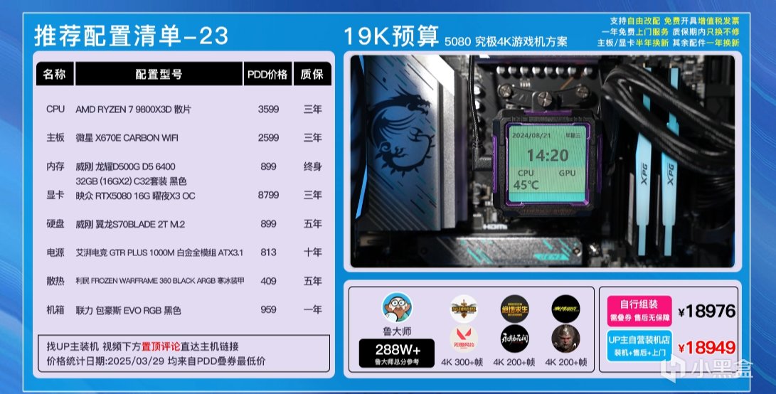 第二套方案是選擇9800X3D來搭配5080,主板選擇的是微星X670E CARBON WIFI,供電擁有18+2+1相,標配4個M.2接口,顯卡插槽剛好還支持PCIe5.0x16,如果你沒有40GBPS接口的需求,這張主板性價比以及規格都是非常不錯的。硬盤升級至2T。電源也升級至艾湃電競的GTR PLUS 1000W白金全模組ATX3.1,依然是10年質保加上全日系電容的用料。