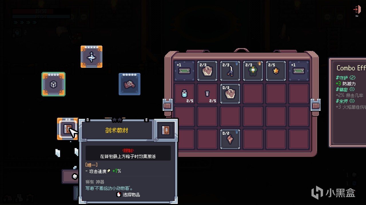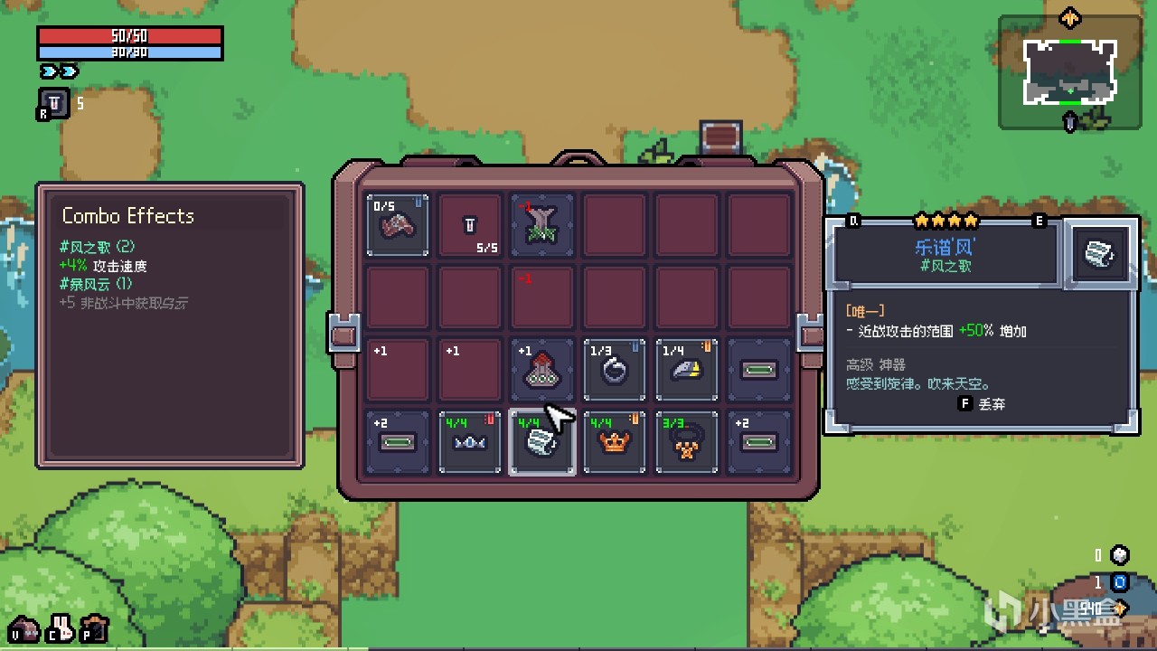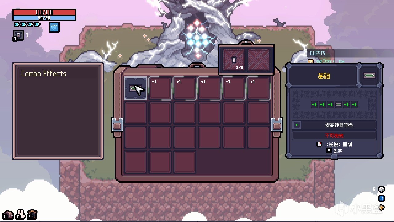 首先一個最顯著的不同點,是遊戲中的所有物品都只佔一個揹包格子。爲了突出“揹包整理”這個玩法,製作組也特地設計了兩種核心道具系統:“神器”與“石板”。玩家在遊戲裏擊殺怪物可以升級,每次升級或者撿到特定道具後可以在5種“神器”以及“石板”之間選擇一種。