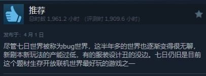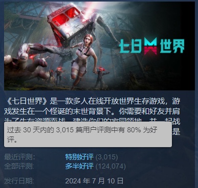 游戏媒体IGN为《七日世界》打出了8分的高分,称赞其“怪物设计是今年最优秀、最古怪的”。在Steam平台上,12万条评价中,73%的玩家给出了好评,近30天的好评率更是攀升至80%。游戏以其独特的末世世界观、深度的建造系统和不卖数值的承诺,赢得了玩家的初步认可。