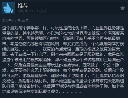 生存游戏有些通病——生存游戏的核心问题在于内容消耗快、重复性强。玩家在短时间内即可体验完所有内容,缺乏新的玩法和挑战。为了维持游戏的生命力,开发者需要通过UGC(用户生成内容)或高频更新来提供新的内容。
