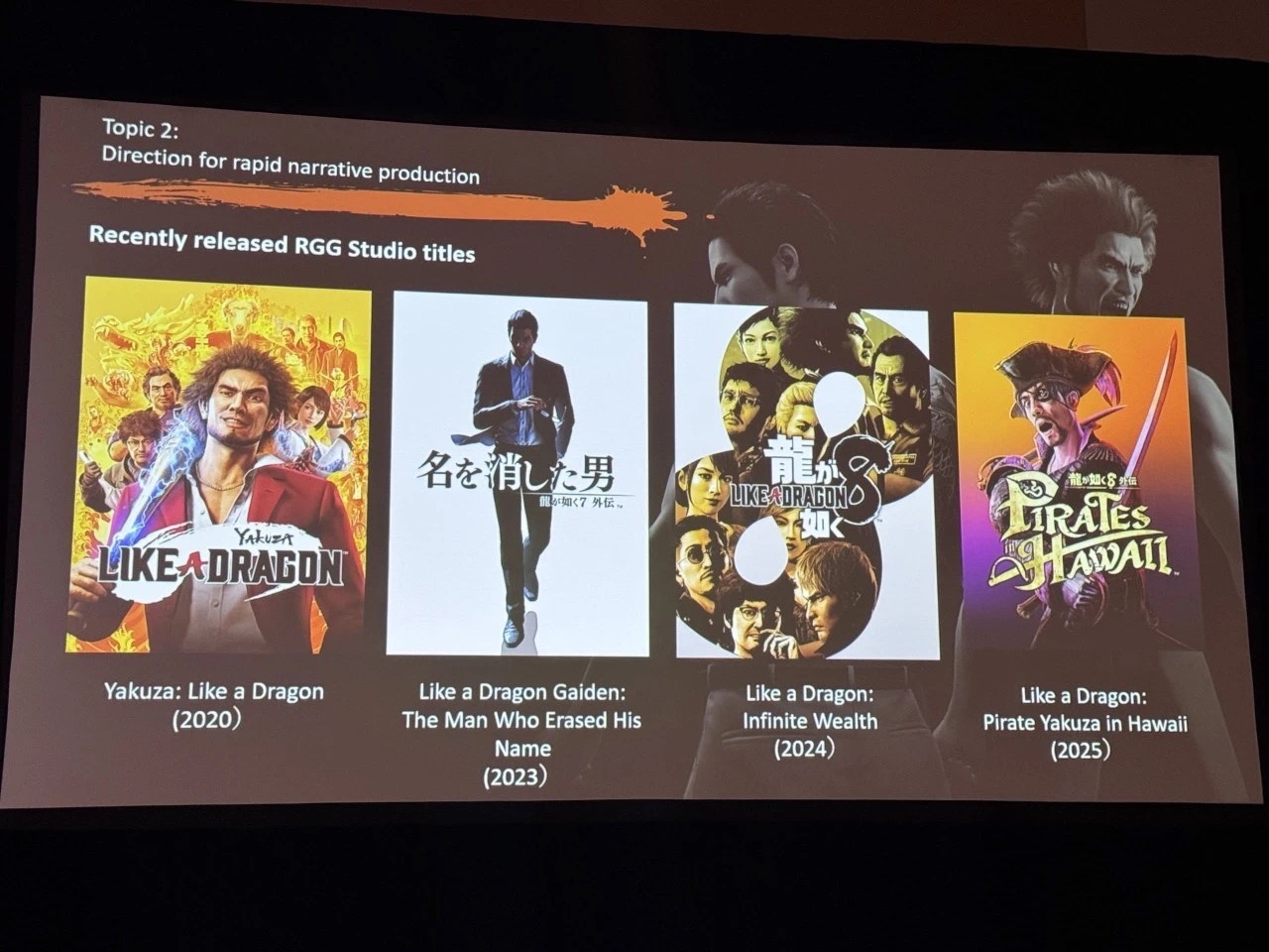 作爲《如龍》系列的研發工作室,Ryu Ga Gotoku Studio(下文簡稱RGG)以其高產在業內聞名。近日,在美國舊金山舉行的2025年GDC會議期間,堀井亮佑(《如龍》系列總監督)、濱津英二(Eiji Hamatsu,世嘉第一業務部設計經理)主持了一場小組座談會,分享了工作室如何在極短週期內開發遊戲,持續推出故事豐富、視覺效果出色的RPG。