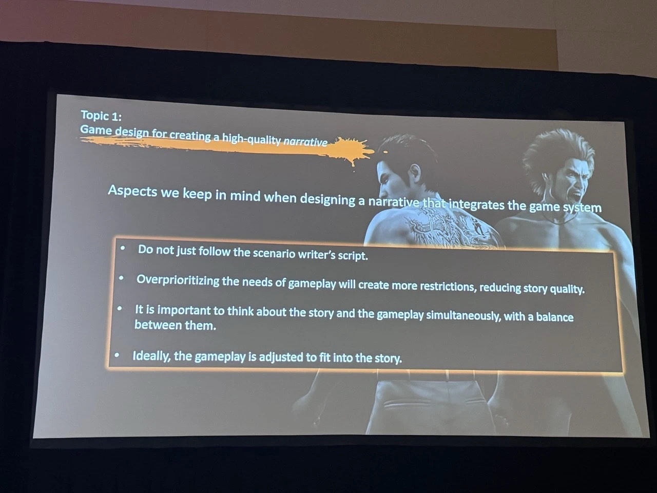 首先,堀井亮佑駁斥了許多遊戲從業者的一種普遍誤解:敘事並不等同於故事。RGG將敘事視爲完整的體驗,即玩家暢玩遊戲時感受到的情感節奏。堀井亮佑在爲演講準備的一份PPT文件中寫道:“故事是主菜,但當一場宴席結束後,好的主菜並不足以保證賓客獲得最大的滿足感。”