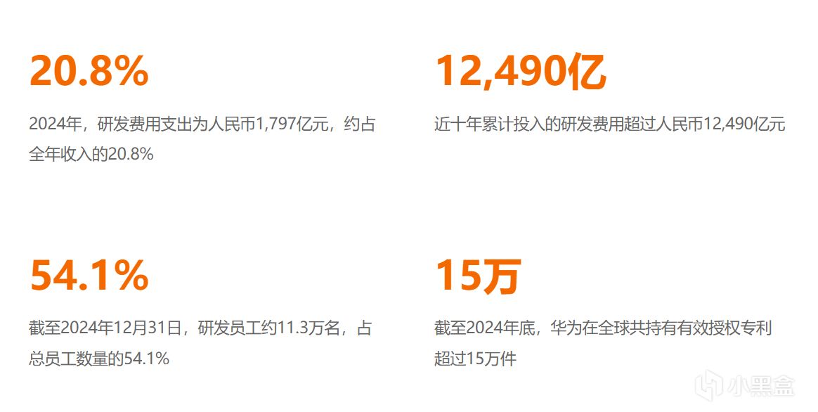 相比於營收,我更關注華爲的研發投入,華爲營收在國內企業中排名並不是很靠前,但要比拼研發投入,華爲絕對遙遙領先。2024年華爲研發投入1797億,佔總營收20.8%。截至2024年12月31日,華爲研發人員11.3萬名,佔總員工數量的54.1%,近10年來華爲累計研發投入12490億。