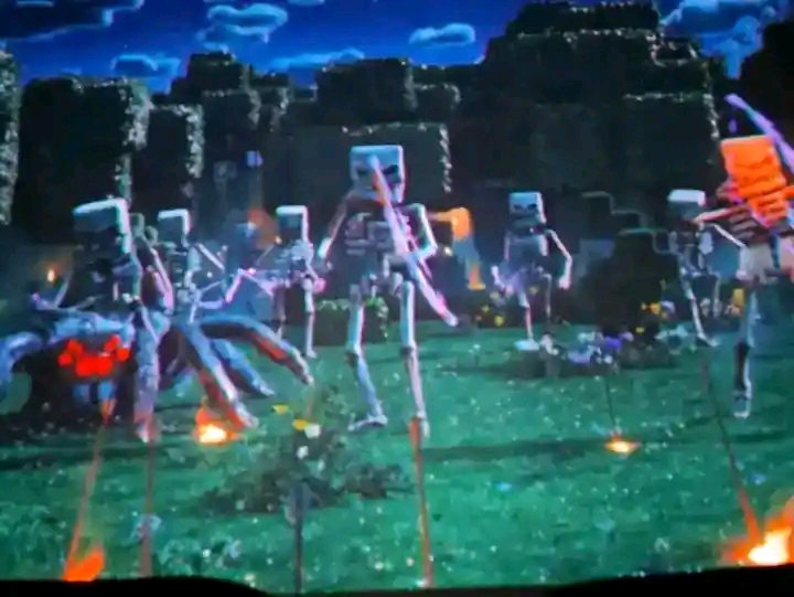 电影里有一段空中被猪灵军队搭载恶魂的追逐战,但是这段里的恶魂与其说是游戏里的那种下届生物不如说是换了个皮肤的热气球#(阴险) 非常脆弱一碰就会和热气球一样爆炸,虽然也会吐火球但并没有出现游戏里把火球打回去反弹打败恶魂的场面。