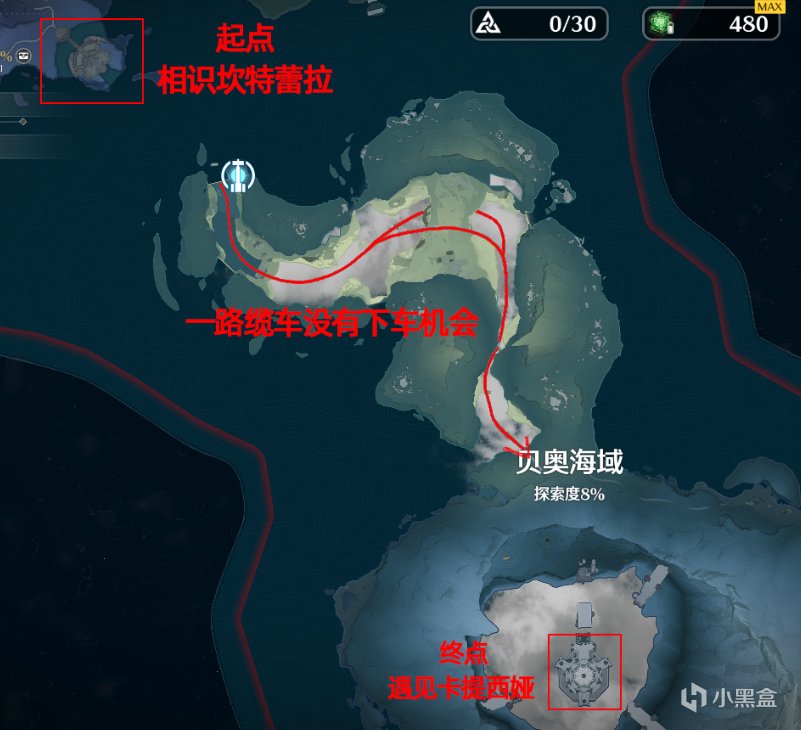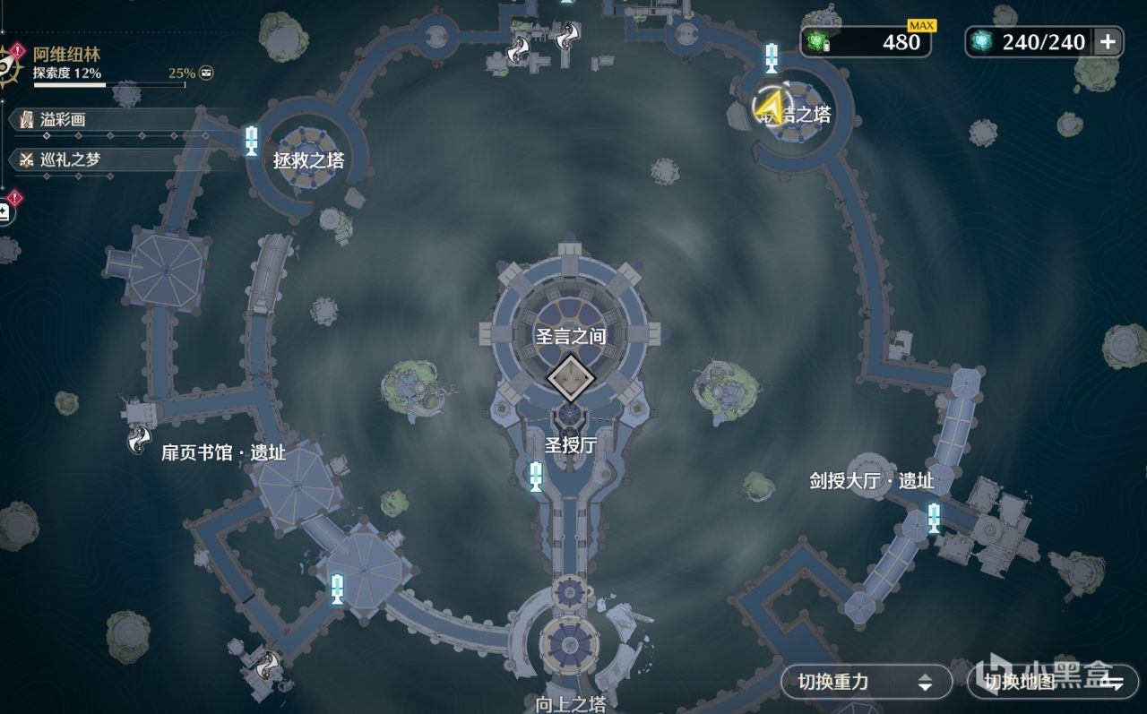 從故事的開始進入翡薩烈城堡相識坎特蕾拉開始,我們就進入了一條被規劃好的道路,從城堡後門出發上纜車,一路聽着坎特蕾拉的講解,前往顛倒的神學院,在神學院地上入口遇見卡提西婭,一起前往空中的阿維紐林,我們可以看到,整個旅行只佔用了這塊地圖的8%,中間節奏非常緊湊,也沒有別的地方可以去,被故事裹挾着進入下一地圖,把劇情留給箱庭,把大世界留給劇情結束之後的我們探索。