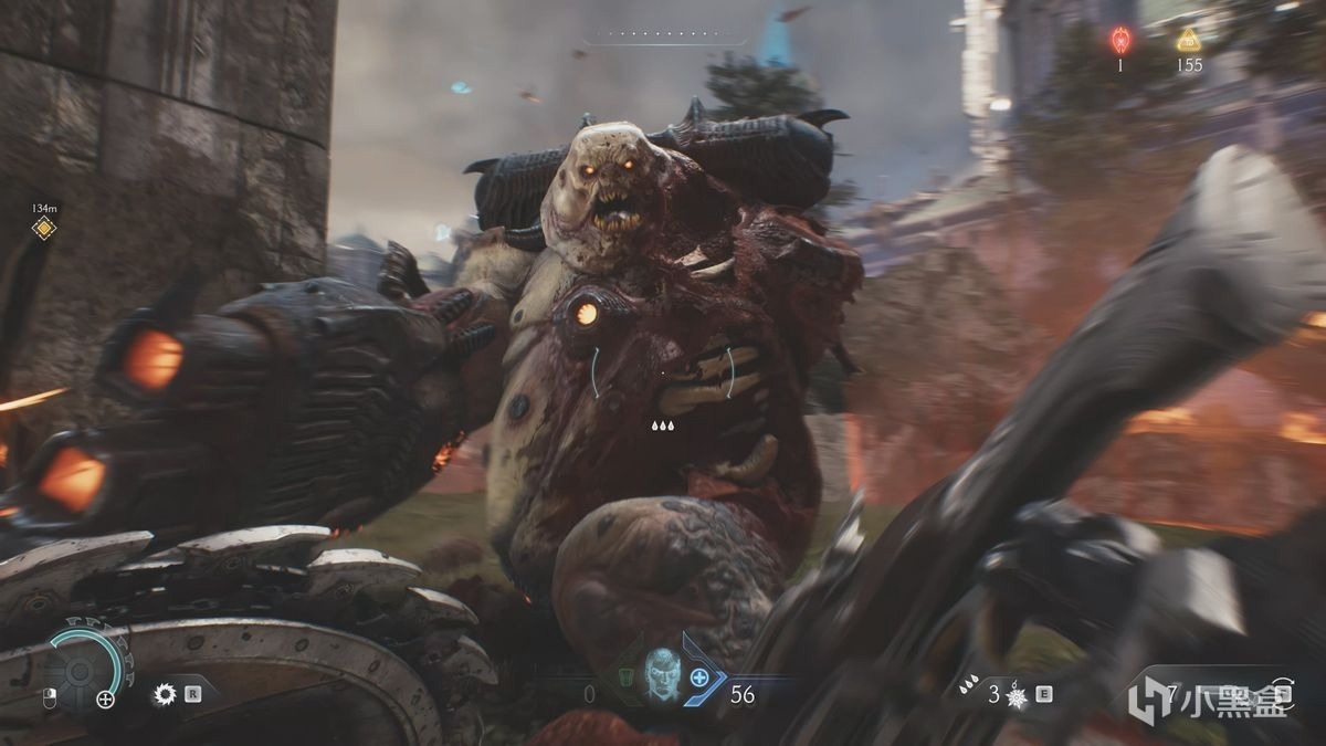 或者說鏈錘對爪牙、盾牌對利齒,甚至超級霰彈槍對血肉——你的破壞工具庫豐富多彩:除拳腳外,還有流星錘、可投擲的鏈鋸盾牌等兵器。使用它們的感覺美妙絕倫,每記攻擊都充滿分量感與粉碎快感,而毀滅戰士拖着 2000 磅裝甲哐當行進的姿態,以及慵懶揮動巨掌湮滅敵羣的畫面,彷彿這位猛男經歷了千年肌肉特訓。