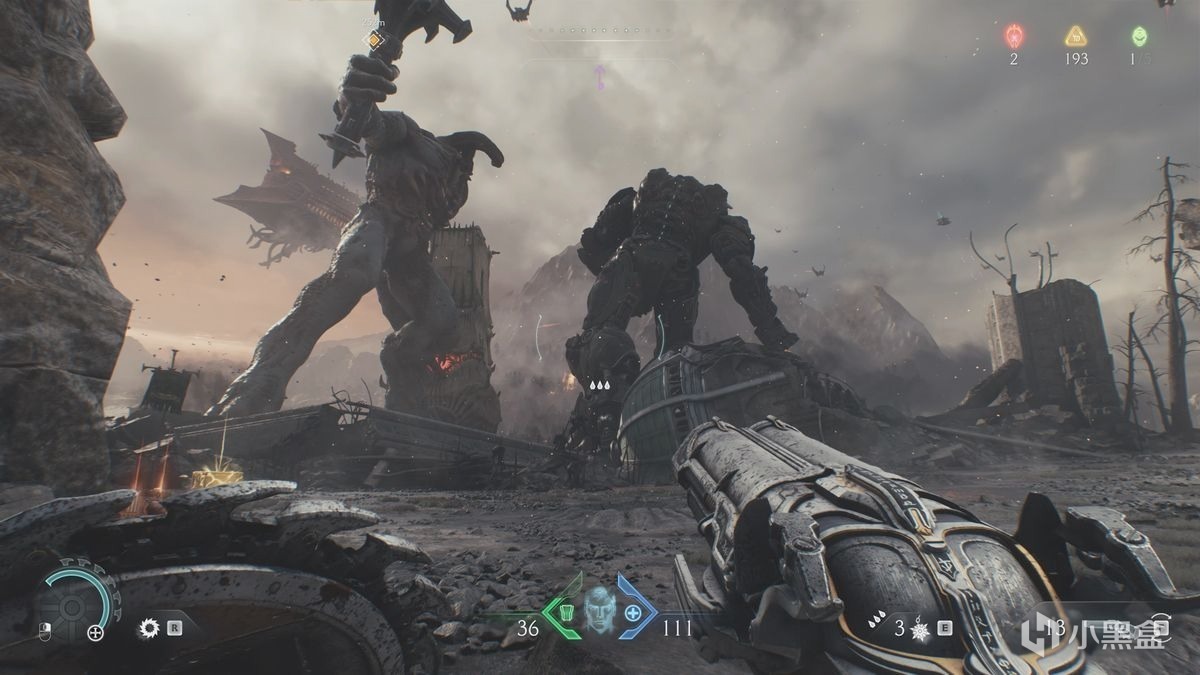 值得慶幸的是,本作對招架與近戰的側重並未將 2016 年後的《毀滅戰士》變成全新物種。改變確實存在且足夠顯著,但本質上是節奏變化而非系統重構——如同用熟悉樂器演奏新曲。前兩作讓我感覺始終處於亡命奔襲狀態,歡快掃射惡魔羣潮,僅偶爾暫停施展處決技;而《黑暗時代》迫使我不斷在兩種模式間切換:熟悉的戰場高速機動,以及與巨型敵人的定點對決。