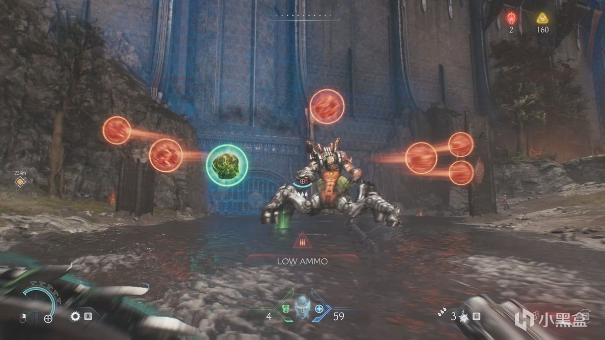 儘管如此,我們的英雄依然武裝到牙齒:從經典的超級霰彈槍到碎顱高射炮,槍械依舊重要,只是定位發生轉變。我發現自己主要用遠程武器快速清理煩人雜兵以便專注對付大傢伙,或在近身前削弱重甲敵人——持續傷害可使護甲過熱,此時投擲盾牌不僅能破除防禦,還能引爆周邊敵人,將其化爲令人滿足的"嗡鳴"吸收護甲碎片,讓這套循環始終充滿快感。