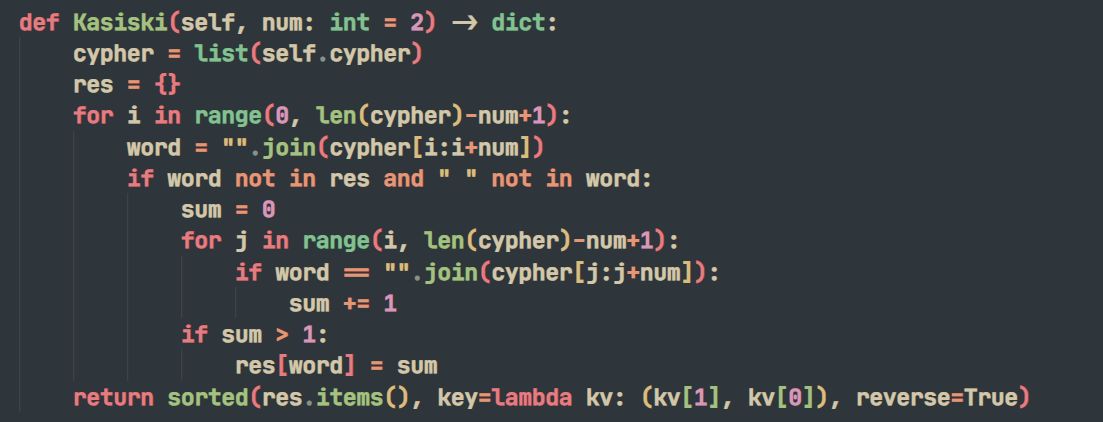 我們可以從密鑰尋找突破點。每一組明文段都用相同的密鑰,不難發現如果正好有三個相同字母組被分割到了不同組內的相同位置,那麼他們的密文就是相同的。例如[(athe),(abcd),(bthe)],選取任意一個長度爲4的密鑰,明文中的"the"按照上一節的步驟都會被加密成同一個密文。