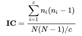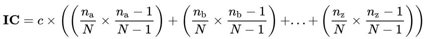 其中c是歸一化係數,用於對不同字母表進行歸一化處理(英語爲26),n下標a是字母“a”出現在文本中的次數,N是文本的長度。重合指數也可以用求和的形式來表示: