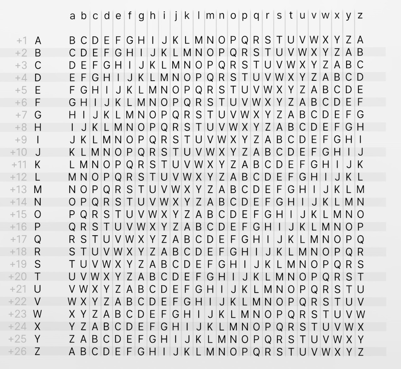 每一組中的明文字母根據密鑰對應位置的偏移量向右進行偏移,如第一組中的第2個字母"L",對應偏移量爲25得到密文,即En=(12+25) mod 26=K。